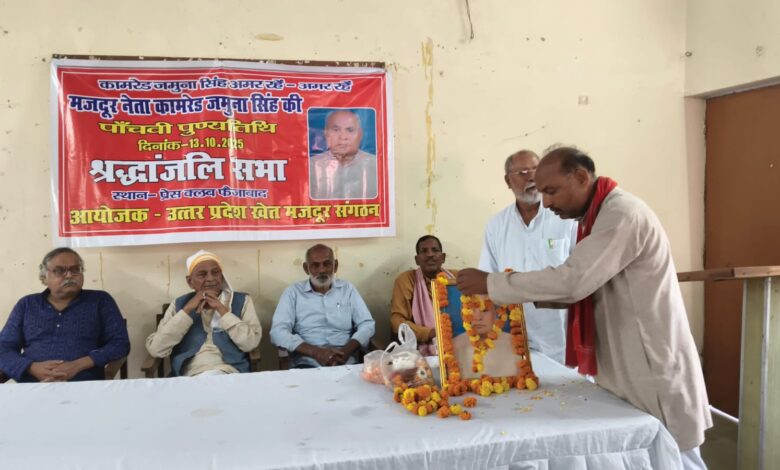 ट्रेड यूनियन के जुझारू नेता व भाकपा के पूर्व जिलामंत्री कामरेड जमुना सिंह की पुण्यतिथि पर प्रेस क्लब फैजाबाद के सभागार में उत्तर प्रदेश खेत मजदूर संगठन की ओर से श्रद्धांजलि सभा का आयोजन किया गया जिसकी अध्यक्षता उत्तर प्रदेश लोक निर्माण विभाग श्रमिक संघ के प्रदेश अध्यक्ष कामरेड सत्यनारायण त्रिपाठी ने किया। कार्यक्रम का संचालन भाकपा के जिलामंत्री कामरेड अशोक कुमार तिवारी ने किया।