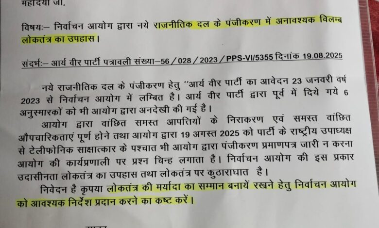विश्व के सबसे बड़े लोकतांत्रिक देश भारत में निर्वाचन आयोग का मनमाना रवैया लोकतंत्र की विश्वसनीयता पर संदेह प्रकट करता है। आर्य वीर पार्टी के राष्ट्रीय अध्यक्ष वीरेन्द्र मिश्र ने भारत निर्वाचन आयोग के मनमाने पन तथा व्याप्त भ्रष्टाचार के खिलाफ देश की राष्ट्रपति द्रोपदी मुर्मू को पत्र लिखकर शिकायत की है कि आर्य वीर पार्टी के नाम से एक नये राजनीतिक दल के रूप में पंजीकरण हेतु पत्रावली विगत 23 जनवरी 2023 से लम्बित है। “आम जन पार्टी” के नाम से पार्टी को रजिस्ट्रेशन करने का अनुरोध किया गया था, इस नाम से अभी तक कोई पार्टी पंजीकृत नहीं है फिर भी आयोग, मिलते-जुलते नाम बताकर एक वर्ष तक टरकाता रहा। आर टी आई से सूचना मांगने पर एक वर्ष बाद आयोग ने पार्टी का नाम “आर्य वीर पार्टी ” तय किया। इसके पश्चात छोटी छोटी कमी दिखाकर तीन वर्ष लगा दिया। मैंने मुख्य निर्वाचन आयुक्त तथा सचिव को की रिमाइंडर दिये परन्तु आयोग द्वारा लगातार अनदेखा किया जाता रहा।14 अगस्त 2025 को आयोग द्वारा उत्तर प्रदेश निर्वाचन अधिकारी के कार्यालय प्रतिनिधि द्वारा 19 अगस्त को आयोग के अधिकारी से टेलीफोनिक साक्षात्कार में उपस्थित रहने हेतु पत्र प्राप्त हुआ इस पत्र में भी एक त्रुटि दूर करने की बात कही गई। मैंने साक्षात्कार से पूर्व ही 18 अगस्त को निर्वाचन आयोग द्वारा इंगित त्रुटि संशोधित कर , आर्य वीर पार्टी के संविधान की संशोधित प्रति समस्त पष्ठों पर हस्ताक्षर कर स्पीड पोस्ट से भेजा। समस्त औपचारिकतायें पूर्ण होने के पश्चात भी आयोग द्वारा पंजीकरण प्रमाणपत्र न जारी करना आयोग की निष्पक्ष तथा सदाचारी कार्यप्रणाली पर प्रश्नचिन्ह लगाता है।